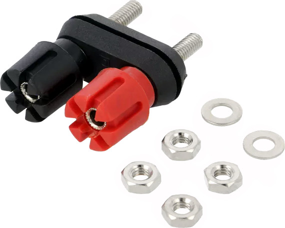 All assemblies are supplied with terminals pre-assembled into the top mounting plate and with two plain washers, two spring washers, (except TPP4), and four nuts. TPP3 and TPP5 have a 10 × 32 UNF thread. TPP4 has 2BA thread as standard and is also available with 10 × 32 UNF thread. All models can be supplied with either a nickel or gold plated finish and different stud lengths are available on certain models. Clear plastic knobs and fittings can be supplied on custom versions. Red and black blanking plugs are available for inserting into the 4mm end-holes to comply with European safety regulations.