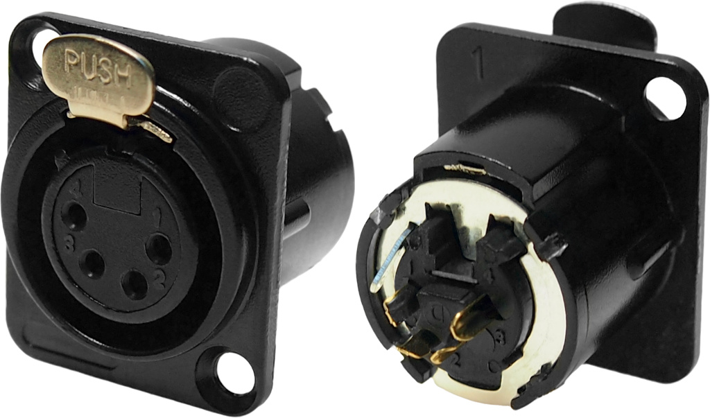 4-pole, black metal, female socket. XLR-format panel cut-out.