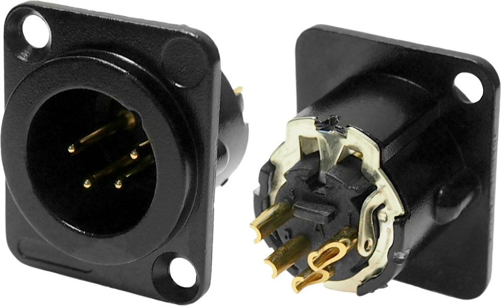 5-pole, black metal, male socket. XLR-format panel cut-out.